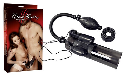 Bad Kitty Penis Pump is a smoke grey penis pump with a measuring scale up to 20 cm. The penis pump has three sleeves of different size, all sleeves elastic. Hose with pump ball, outlet valve, vibro bullet with remote control and multi-speed vibration. Batteries not included.